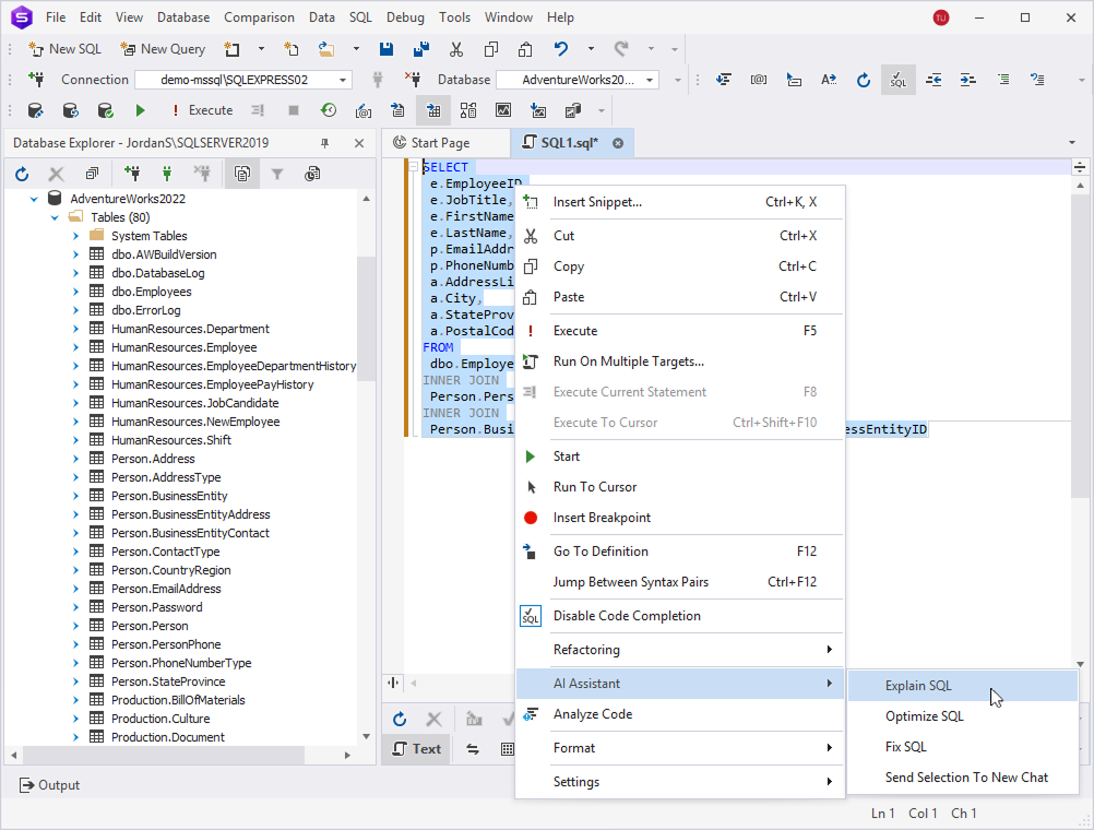- Explain SQL – Creates a request in a new AI chat to explain the selected code fragment.