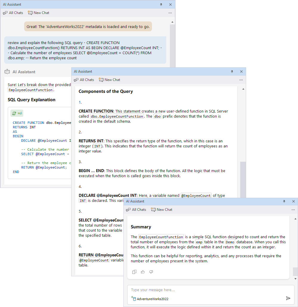 AI Assistant helps you understand what the query does and how it works by breaking it down into components, providing detailed explanations and a concise summary.