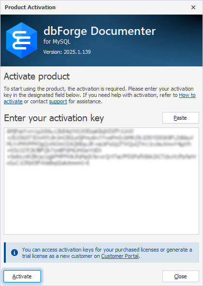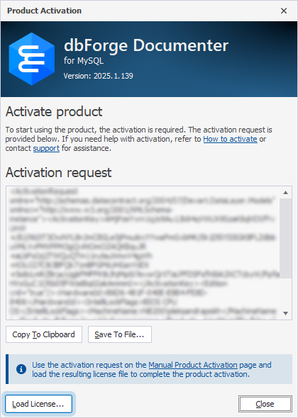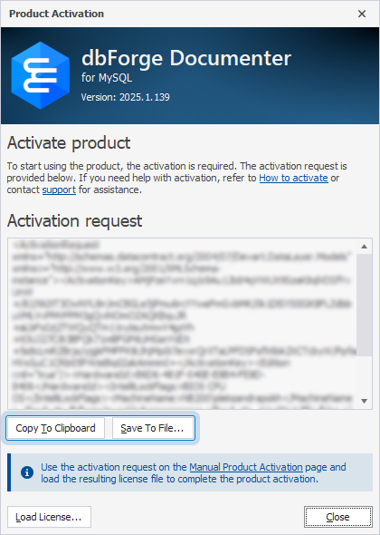 After installing dbForge Documenter for MySQL, you need to activate the application—even for the trial version. You can do this directly within the application or via the command line.