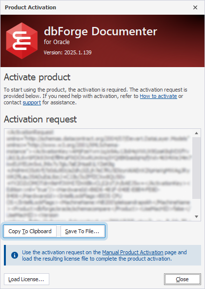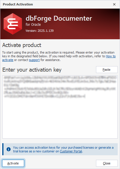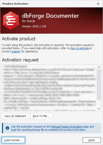 After installing dbForge Documenter for Oracle, you need to activate the application—even for the trial version. You can do this directly within the application or via the command line.