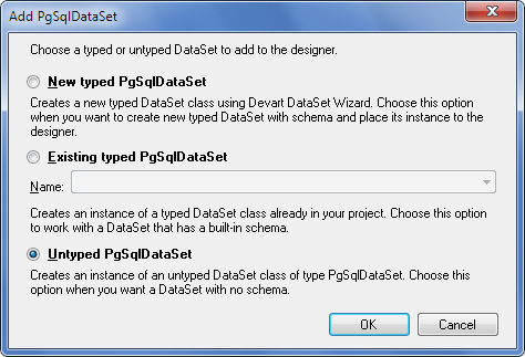 Create an untyped DataSet PgSqlDataSet1. To do this, you may either drop an PgSqlDataSet object to the form or double-click it in the toolbox. Select the Untyped PgSqlDataSet option and click OK: