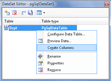 Generate data table schema. Populate the Columns collection of the data table by clicking the Create Columns item from the table item pop-up menu:
