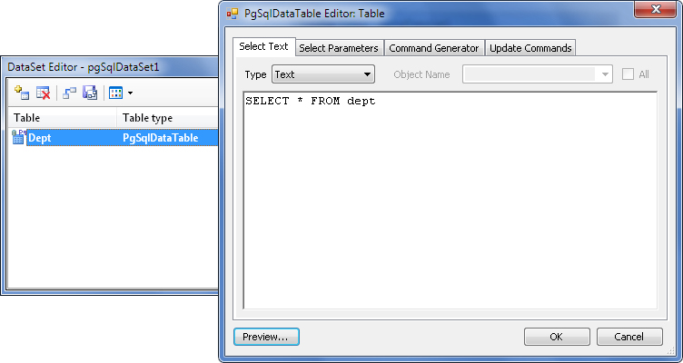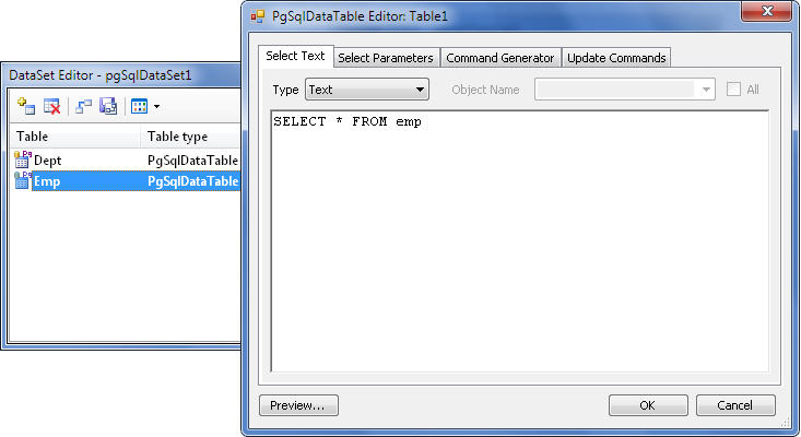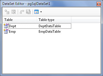 In this tutorial, we will create a strongly typed DataSet from an untyped one. It will include tables Dept and Emp; for their definitions, see the tables.sql script which is located in the dotConnect for PostgreSQL installation directory. The following steps need to be performed: