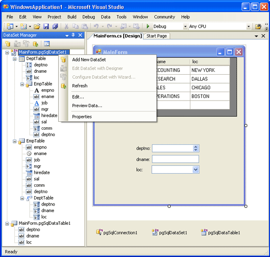 To display the DataSet Manager window,>In the Tools menu, point to PostgreSQL, and then click DataSet Manager. This menu item is only available when a project is open in Visual Studio.