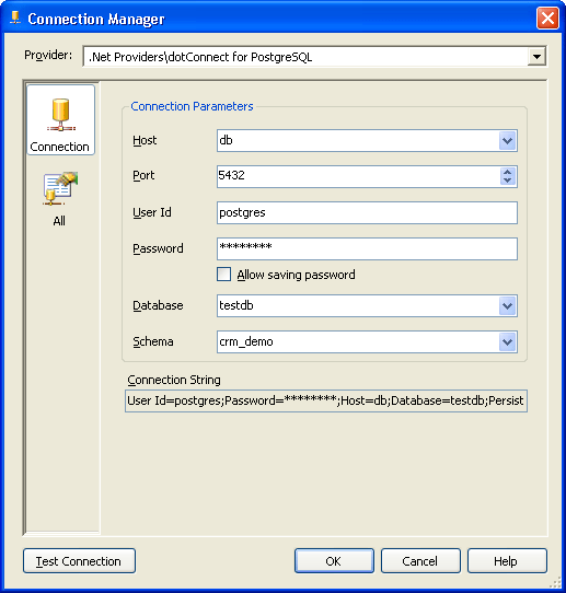 In the Connection Parameters group, provide the connection settings. If you need some advanced settings of dotConnect for PostgreSQL, click the All button to the left.
