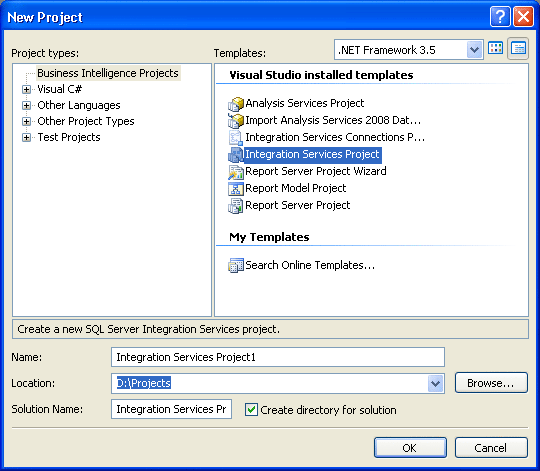 In the New Project dialog box, select Integration Services Project in the Templates pane.