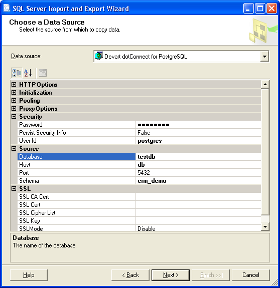 On the Choose a Data Source page, select Devart dotConnect for PostgreSQL as Data source and provide connection settings for your server, click Next. If the connection settings are incorrect, the wizard shows a warning and does not advance to the next step.
