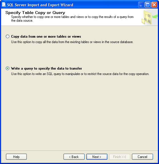 On the Specify Table Copy or Query page, click Write a query to specify the data to transfer. The other option, Copy data from one or more tables or views, allows you to transfer several database objects at once, but for the purpose of this tutorial we will demonstrate flexibility of queries used in the wizard. Click Next.
