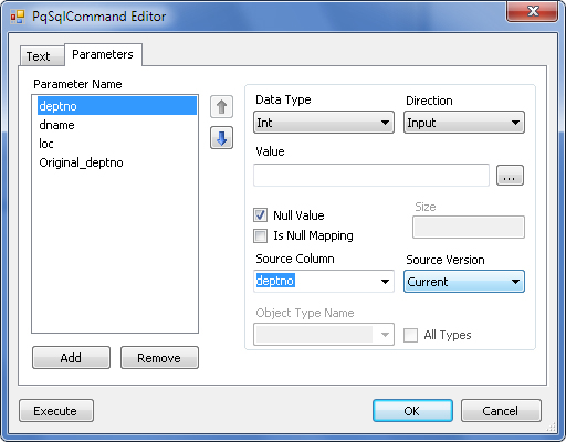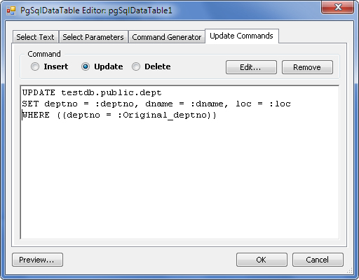 You can specify the SQL statement for each command, delete a redundant command using the Remove button, and tune a command with the Edit button. It opens PgSqlCommandEditor dialog with two pages - CommandText and Parameters.