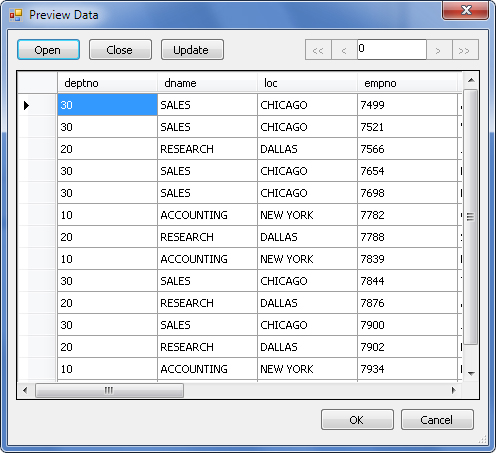 The Open and Close buttons fill and clear the result set accordingly. If you use the only source table, in the Preview Data window you can also modify data in this table and save the changes with the Update button. Note that update commands are dynamically generated based on the columns mentioned in the select query. Thus if your select command does not include table's primary key, data modification may cause data loss or corruption.