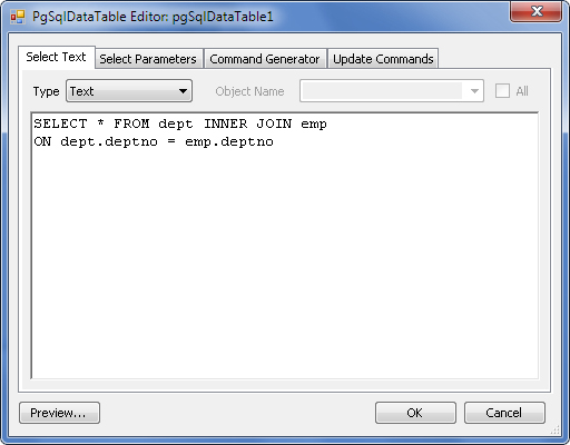 This topic describes how to use command editor for setting SQL commands to the different data access components, like PgSqlDataTable, PgSqlDataAdapter, PgSqlCommand or PgSqlDataSource. To adjust such component, one generally should set up select, insert, update and delete commands, and, if applicable, assign their parameters. The command editor allows doing this in a simple and visual way.
