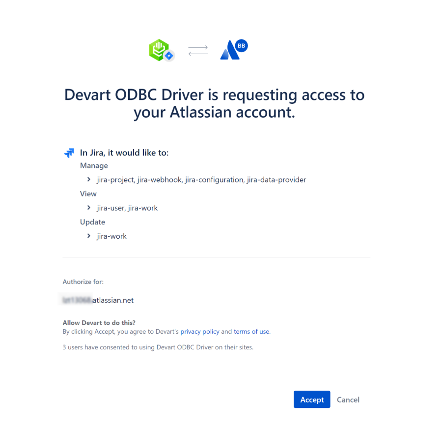 - Provide the access for ODBC Driver for Jira to your Atlassian account.