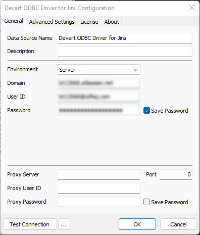 - Select Devart ODBC Driver for Jira and click Finish. The driver setup dialog will open.