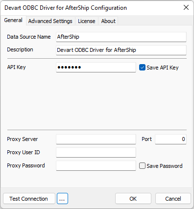 - Select Devart ODBC Driver for AfterShip and click Finish. The driver setup dialog will open.
