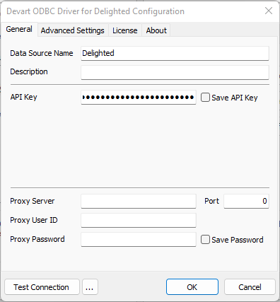 - Select Devart ODBC Driver for Delighted and click Finish. The driver setup dialog will open.