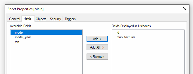 - Once the data has been fetched, you can choose a table layout to present the data in a table. Choose Layout > New Sheet Object > Table Box. Select the fields to be added to the tablebox and click OK.