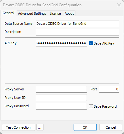 To connect to SendGrid you need to have an API key. Please refer to the following documentation on how get the API key. After installing the driver, create a DSN for Freshservice in the ODBC Data Source Administrator.