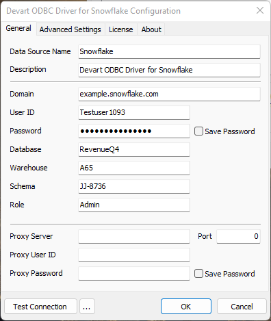 - Select Devart ODBC Driver for Snowflake and click Finish. The driver setup dialog will open.