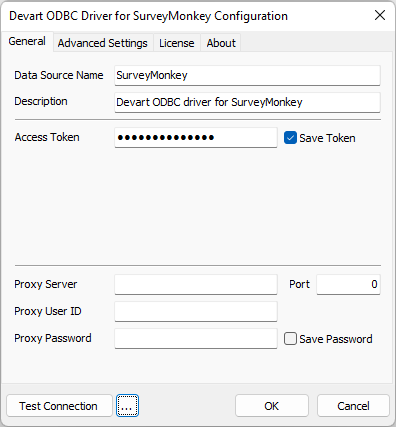 After installing the driver, create a DSN for SurveyMonkey in the ODBC Data Source Administrator.