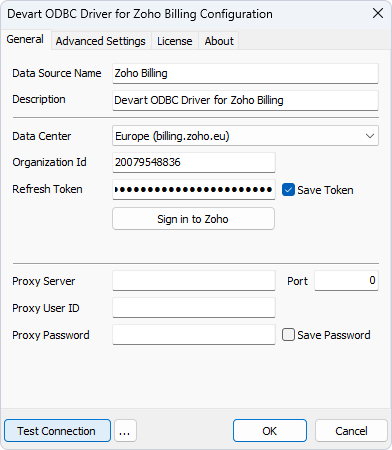 After installing the driver, create a DSN for Zoho Billing in the ODBC Data Source Administrator.