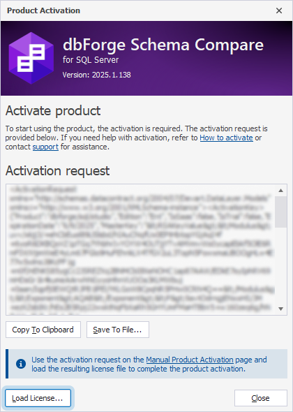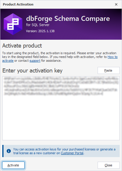 After installing dbForge Schema Compare for SQL Server, you need to activate the application—even for the trial version. You can do this directly within the application or via the command line.