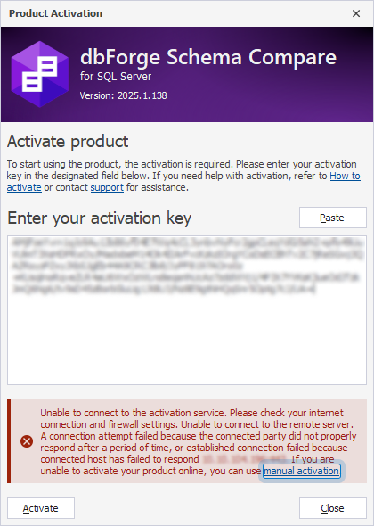 Depending on your internet connection, you can activate Schema Compare for SQL Server in one of the following ways: