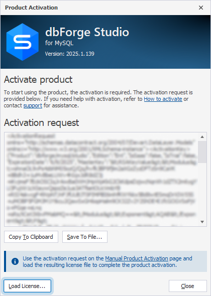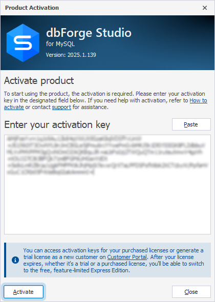 After installing dbForge Studio for MySQL, you need to activate the application—even for the trial version. You can do this directly within the application or via the command line.
