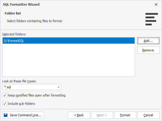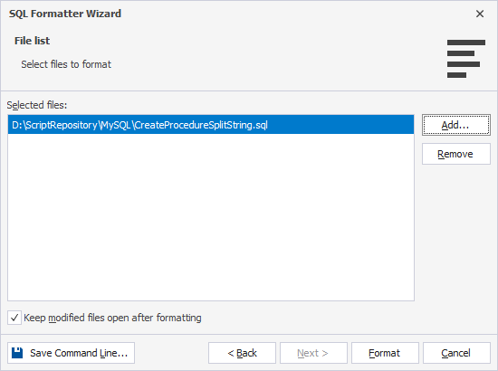 dbForge Studio for MySQL provides the SQL Formatter that enables you to format SQL code efficiently. It also supports bulk formatting that allows you to format multiple selected files or entire folders at once.