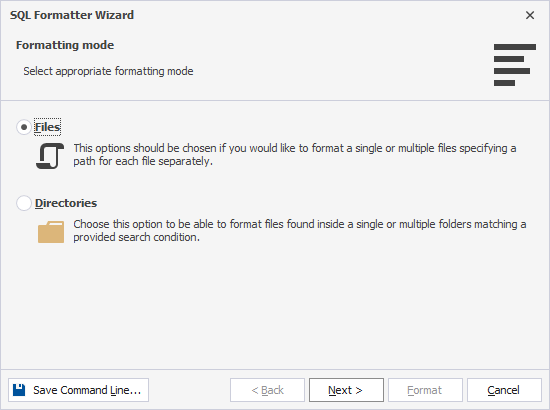 2. On the Formatting mode page of the wizard, the Files mode is selected by default. To proceed, select Next.