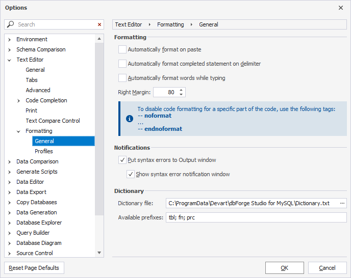 The default path to store a dictionary file is C:\ProgramData\Devart\dbForge Studio for MySQL\Dictionary.txt. To set a different path, specify it in the Dictionary file box.