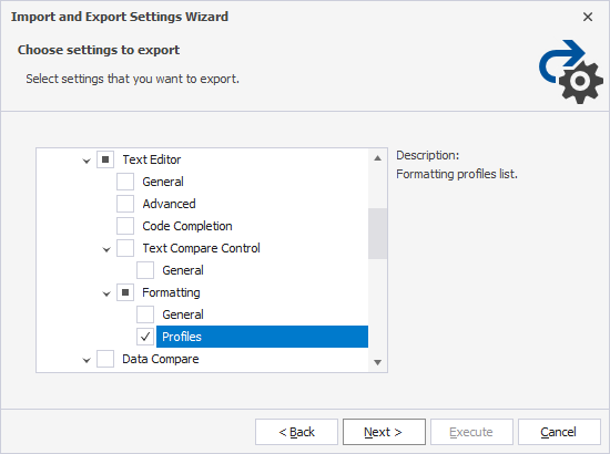 3. On the Choose setting to export page, all the settings are selected by default. To proceed, clear the checkboxes by selecting All settings. Then, navigate to All Settings > Options > Text Editor > Formatting and select Profiles.
