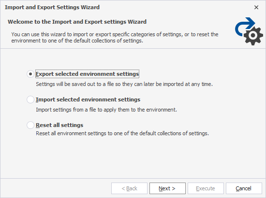 2. In the Import and Export Settings Wizard that opens, select Export selected environment settings and select Next.
