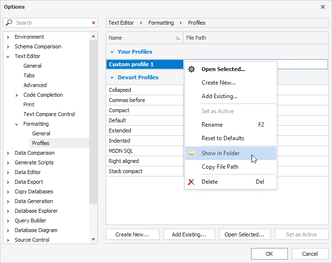 By default, formatting profiles are stored as an .xml file in the following directory: C:\Users\UserName\AppData\Roaming\Devart\dbForge Studio for MySQL\FormatProfiles. If you set a different path to the folder with the profile, do the following: