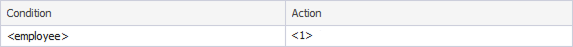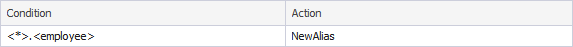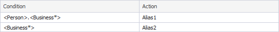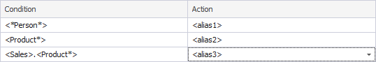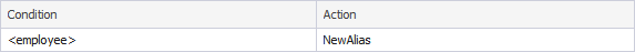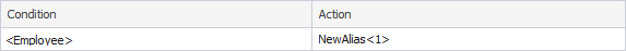 If the Condition column contains only one element, for example, an object identifier, the Action column will have the <1> value by default. This means that if you specify <1> in the Action column for this condition, an alias will be generated according to the standard alias generation algorithm.