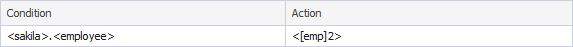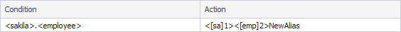 Id<1> - Adds the prefix Id to a generated alias.<[Dept]1> - Excludes Dept from a generated alias.In the Condition column, you can define the criteria under which an alias will be applied based on the corresponding rule in the Action column. These rules are triggered when an identifier—such as a table, view, table-valued function, or synonym—is inserted into a SQL document from the Completion List.
