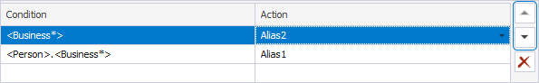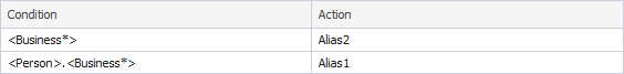 Since both conditions match (BusinessEntity starts with Business), Alias1 is applied because its condition appears higher in the list: