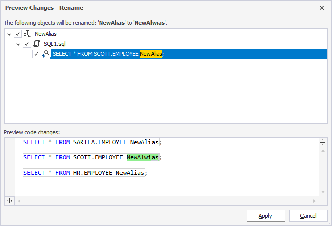 The custom alias NewAlias is applied only when the employee table belongs to the sakila database. In all other cases, dbForge Studio generates aliases according to the standard rules.