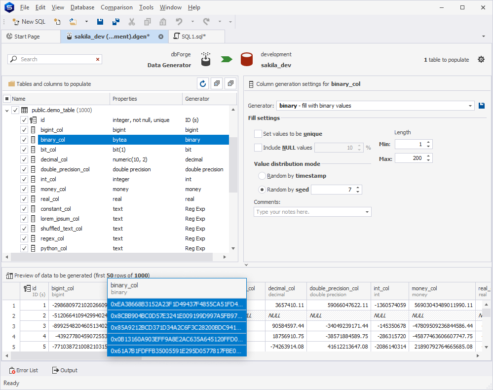 The Binary generator generates binary values. In the Fill settings section, you can set up basic and custom settings.