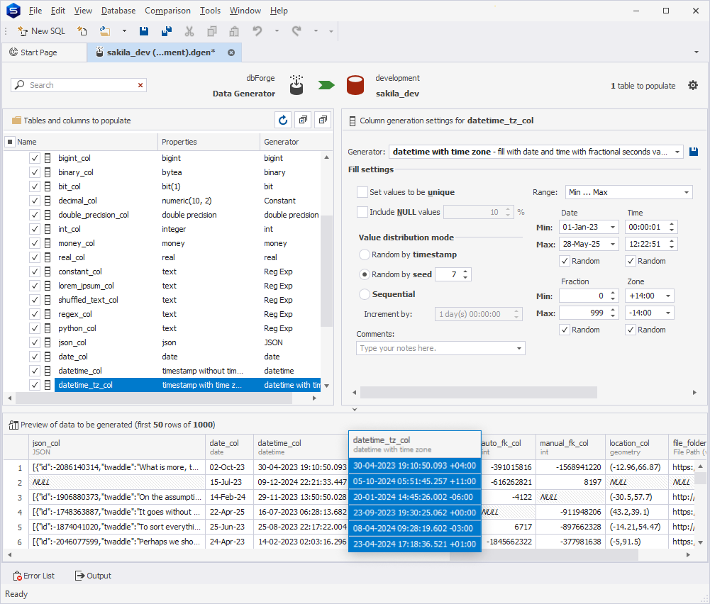 The datetime with time zone generator generates dates and times with fractional seconds values with time zone. In the Fill settings section, you can set up basic and custom settings.