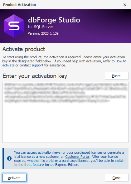 After installing dbForge Studio for SQL Server, you need to activate the application—even for the trial version. You can do this directly within the application or via the command line.